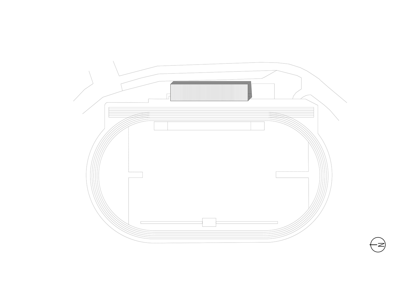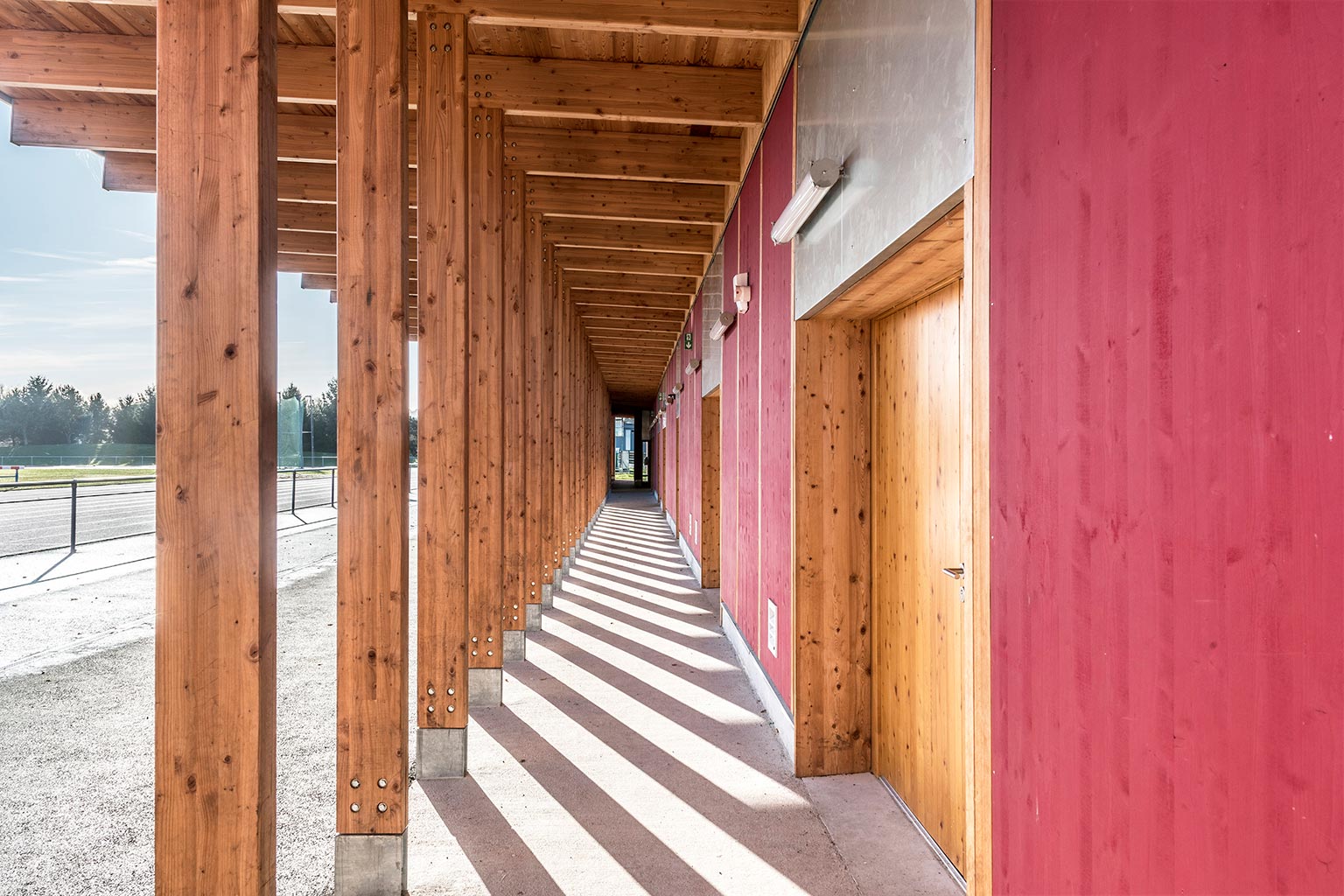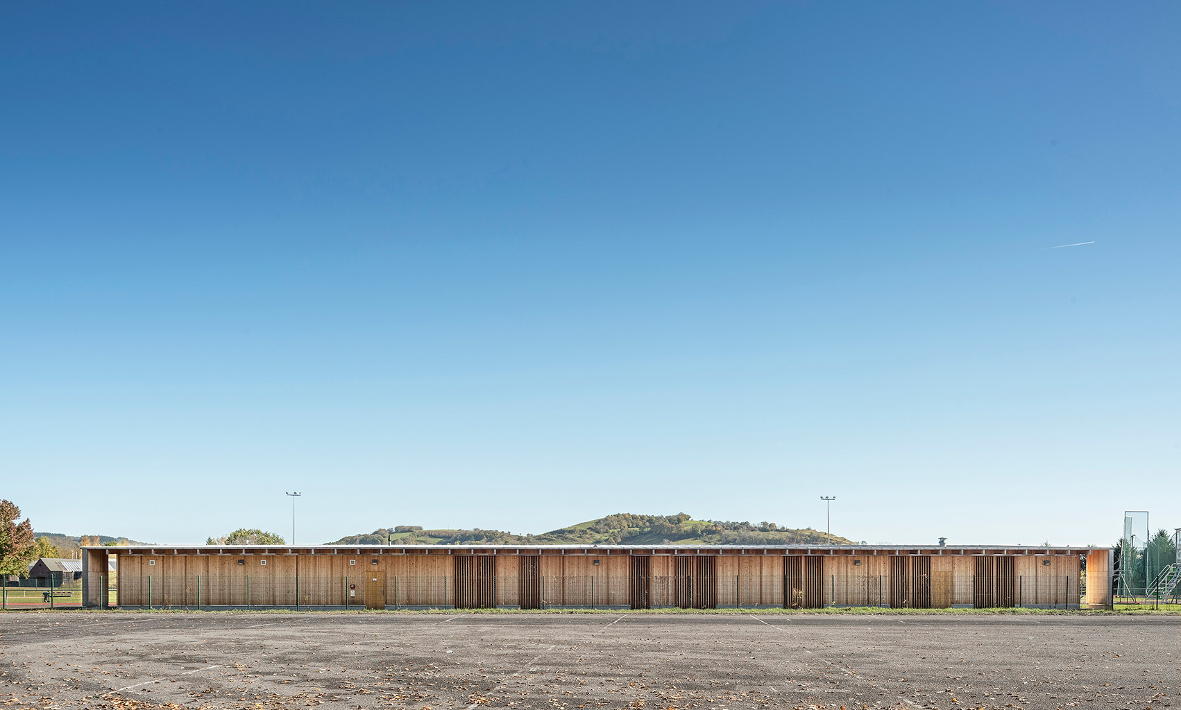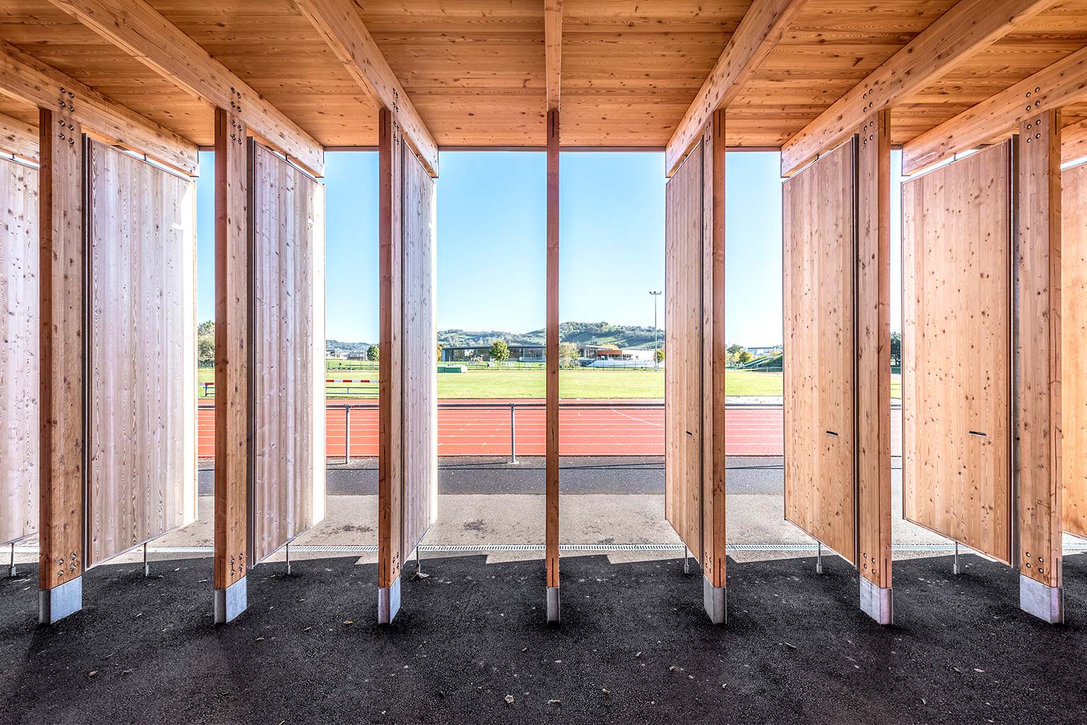 L’équipement sportif du stade d’athlétisme de la CABA comprend des vestiaires, un rangement pour le matériel, des bureaux, un auvent abritant le public et un espace d’échauffement pour les coureurs. L’édifice implanté le long de la piste est conçu comme une halle sous laquelle se glisse un volume linéaire comprenant le programme hors d’air. La halle est composée de portiques resserrés en douglas qui produisent un rythme cinétique le long de la piste. La conception des portiques permet la réalisation d’une large toiture en porte-à-faux abritant les gradins amovibles et l’espace d’échauffement lequel est muni de volets brise-vent montés sur pivots. Pour des questions de pérennité et d’entretien des matériaux de façades, l’enveloppe de l’édifice exposée aux intempéries est revêtue de zinc naturel tandis que les murs abrités sous la halle sont en panneaux trois plis mélèze.