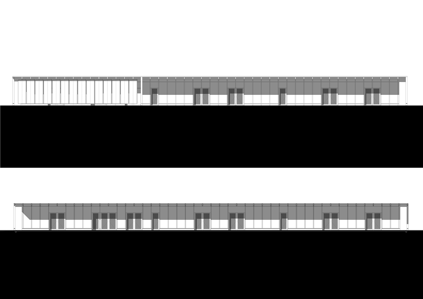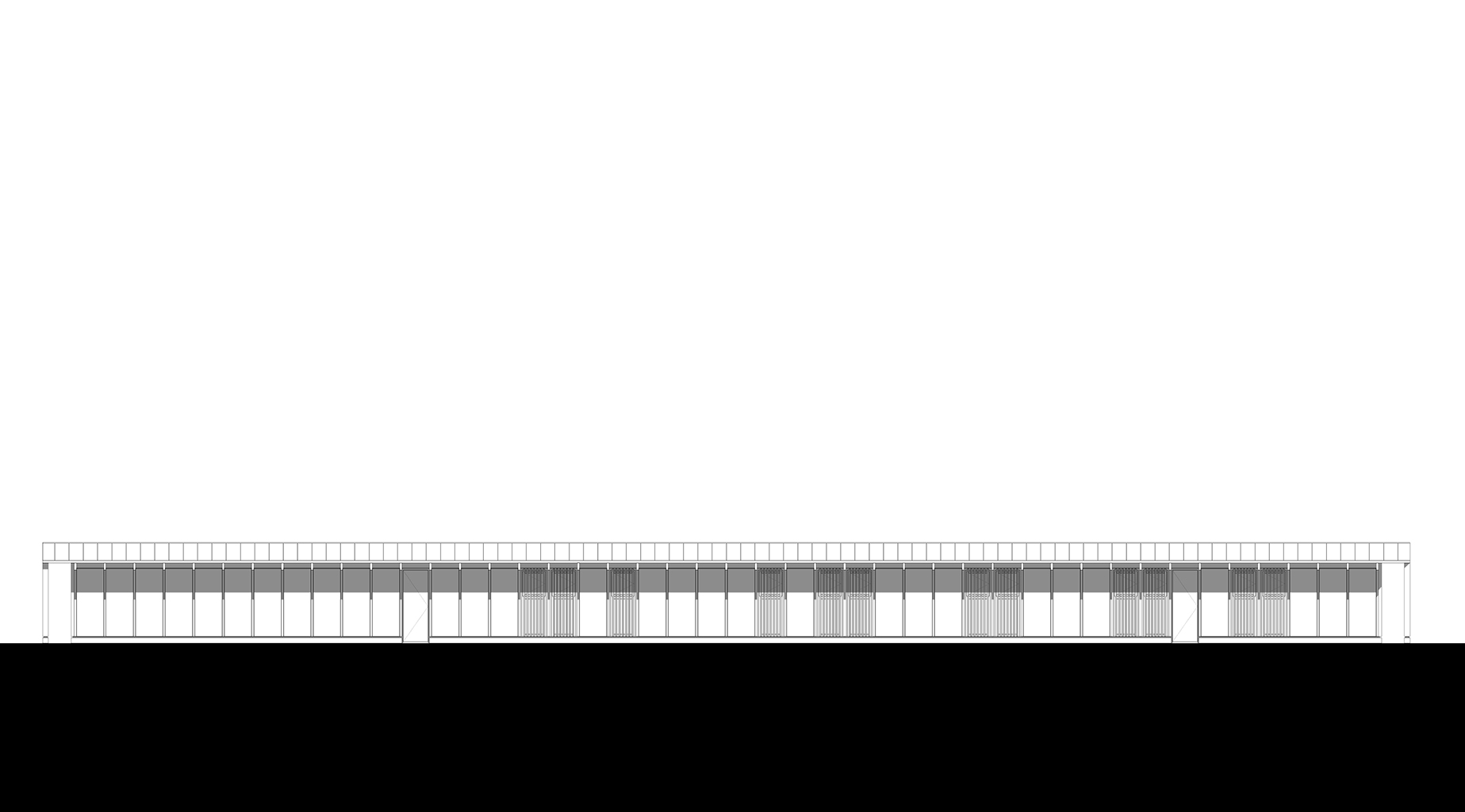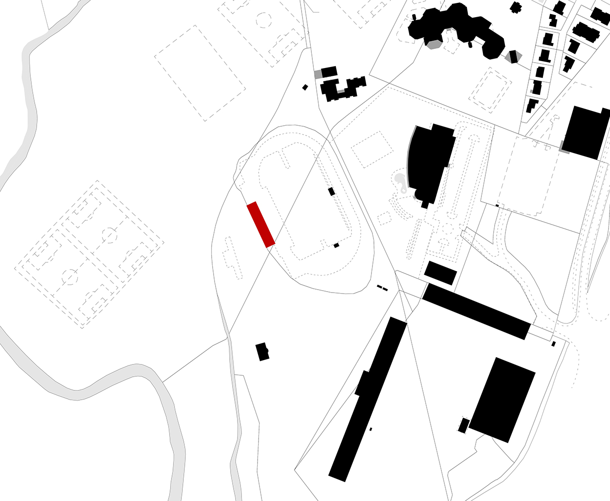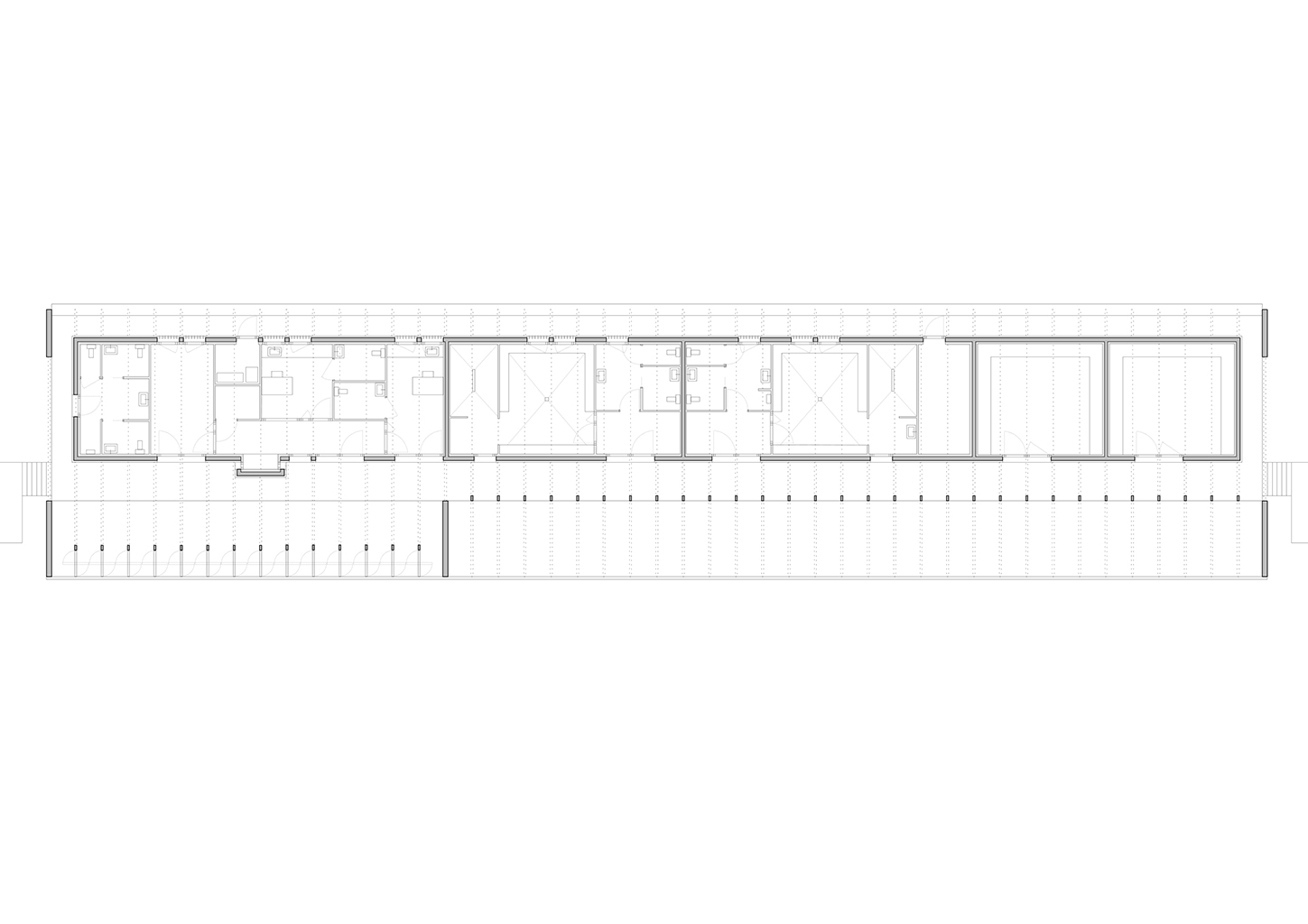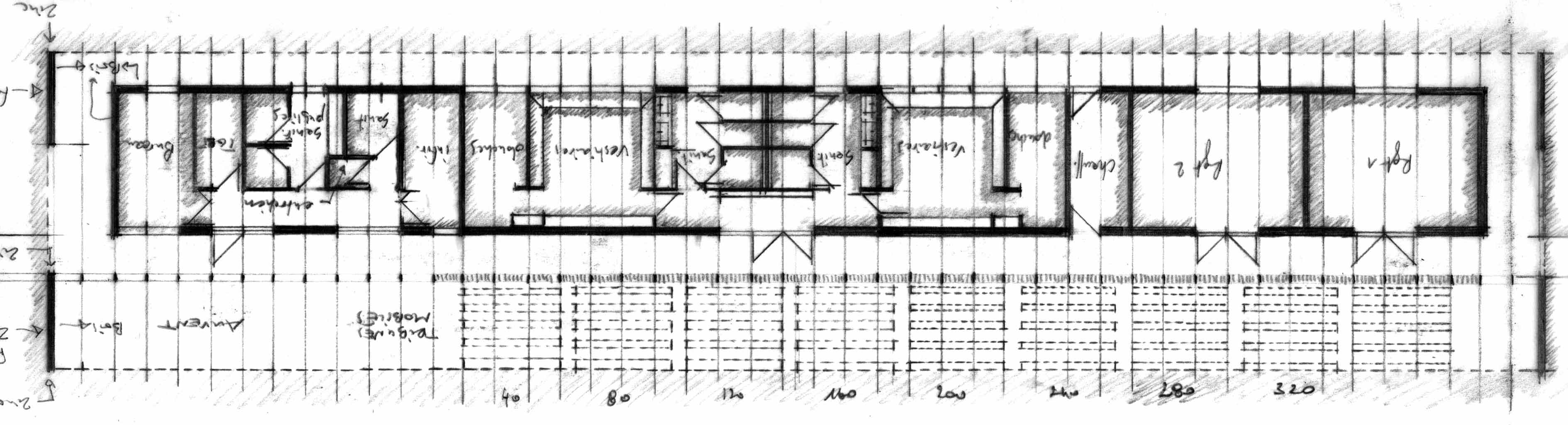 L’équipement sportif du stade d’athlétisme de la CABA comprend des vestiaires, un rangement pour le matériel, des bureaux, un auvent abritant le public et un espace d’échauffement pour les coureurs. L’édifice implanté le long de la piste est conçu comme une halle sous laquelle se glisse un volume linéaire comprenant le programme hors d’air. La halle est composée de portiques resserrés en douglas qui produisent un rythme cinétique le long de la piste. La conception des portiques permet la réalisation d’une large toiture en porte-à-faux abritant les gradins amovibles et l’espace d’échauffement lequel est muni de volets brise-vent montés sur pivots. Pour des questions de pérennité et d’entretien des matériaux de façades, l’enveloppe de l’édifice exposée aux intempéries est revêtue de zinc naturel tandis que les murs abrités sous la halle sont en panneaux trois plis mélèze.