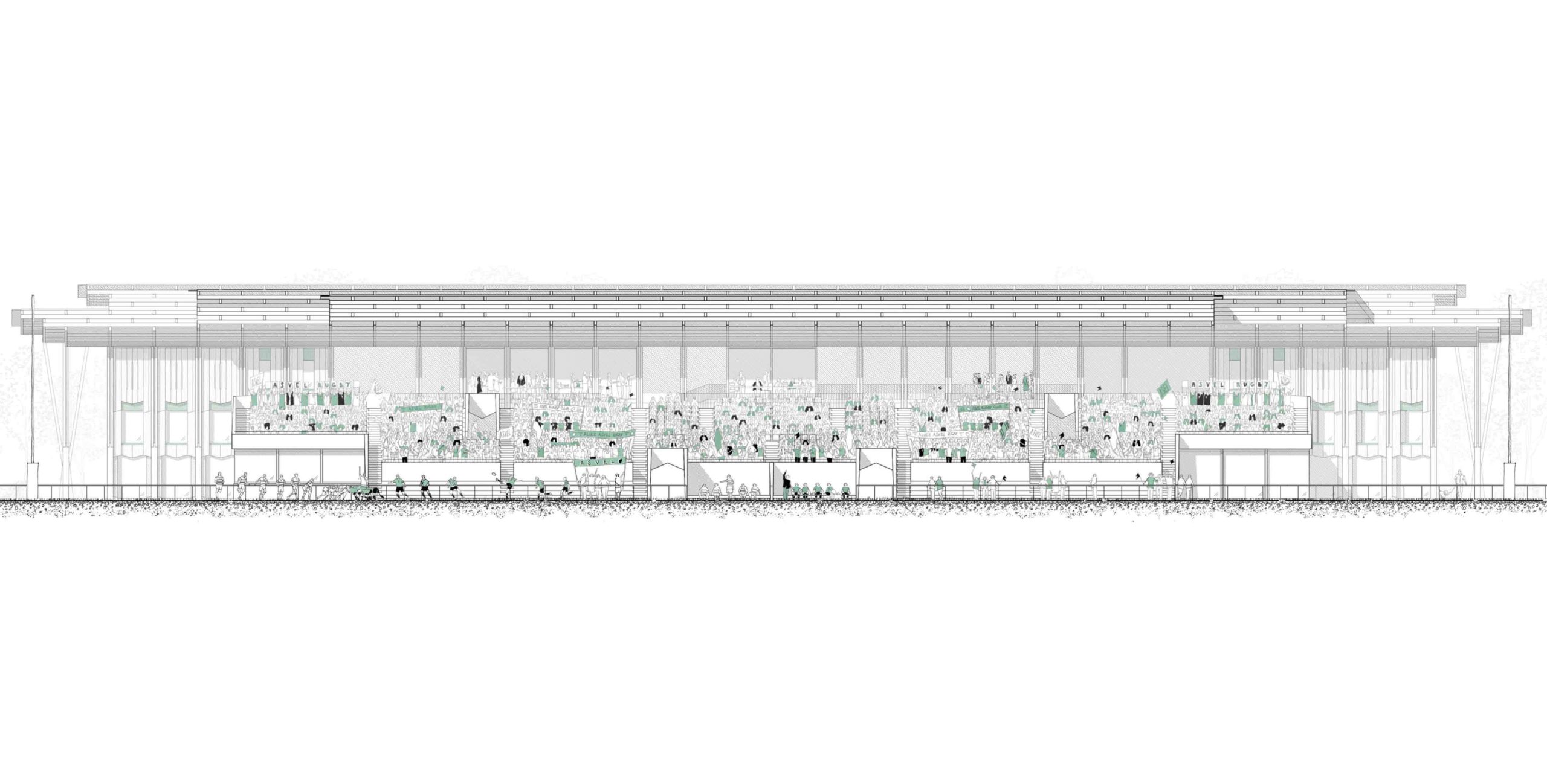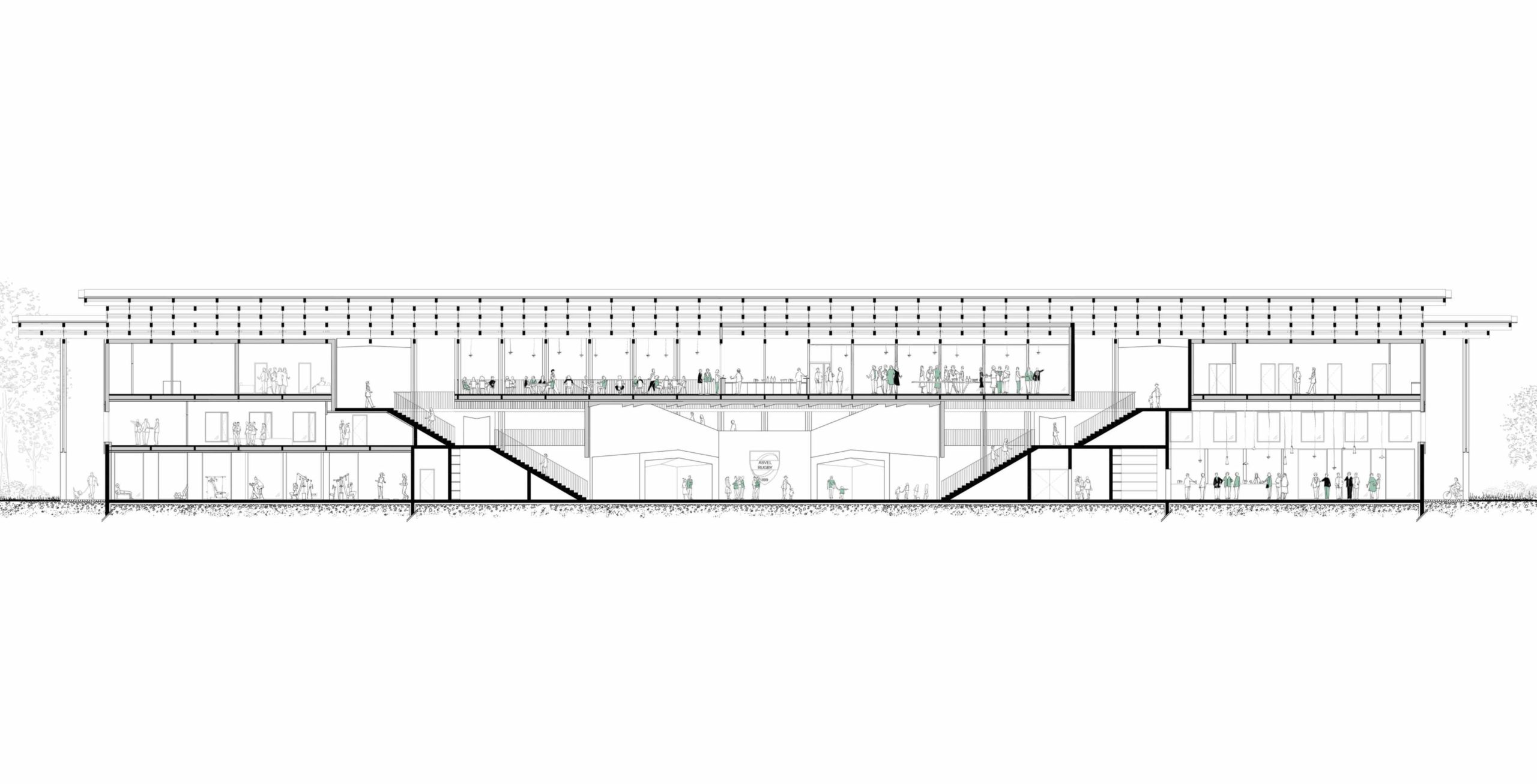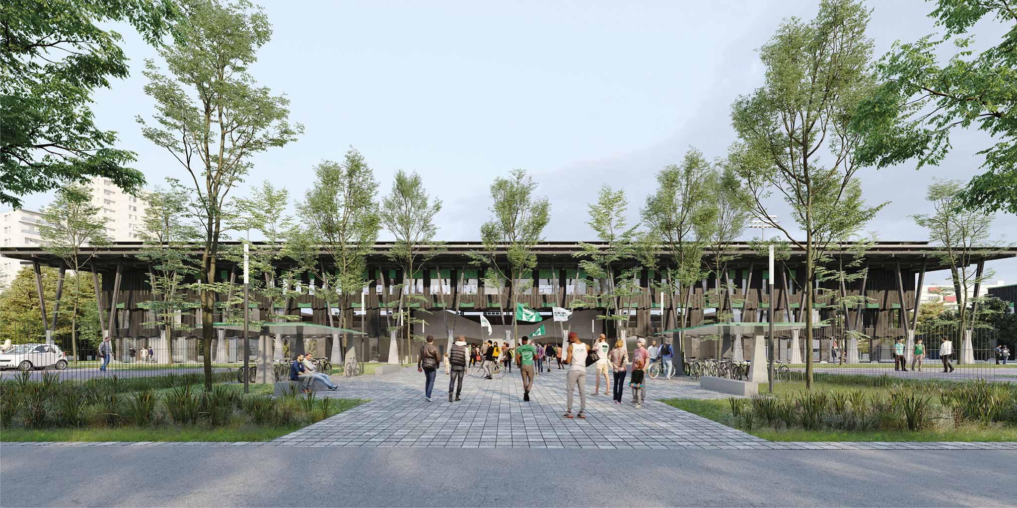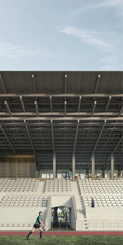 Le projet fabrique un parc urbain dont la qualité paysagère et la cohérence d’ensemble sont favorisées. Un grand toit soutenu par une structure autonome en bois rassemble, par une même figure, l’ensemble des fonctions du site et réuni ainsi les différents usagers et les promeneurs. Cette fédération des fonctions et des usages au sein d’un ensemble cohérent est renforcée par le registre architectural commun aux différentes façades. Les murs à ossatures bois de la nouvelle tribune et des vestiaires rénovés sont bardés de panneaux de bois dont le découpage singulier et les couleurs confèrent une identité propre au site et, par extension, au club.