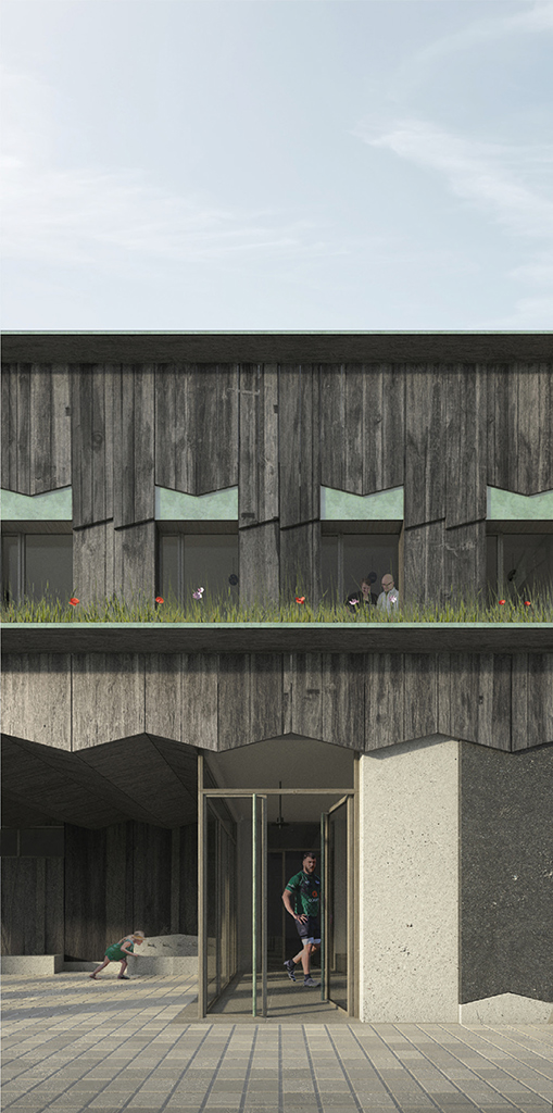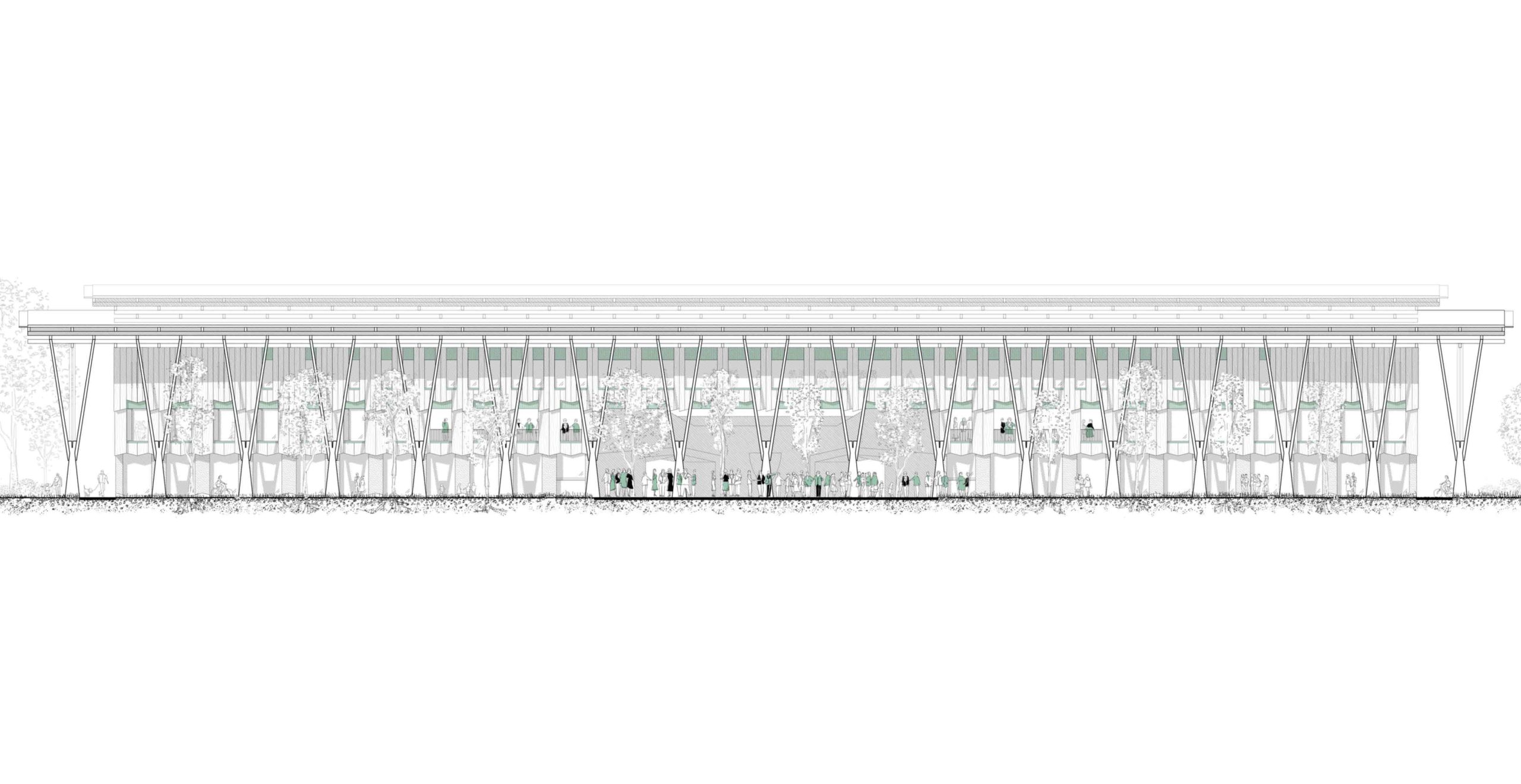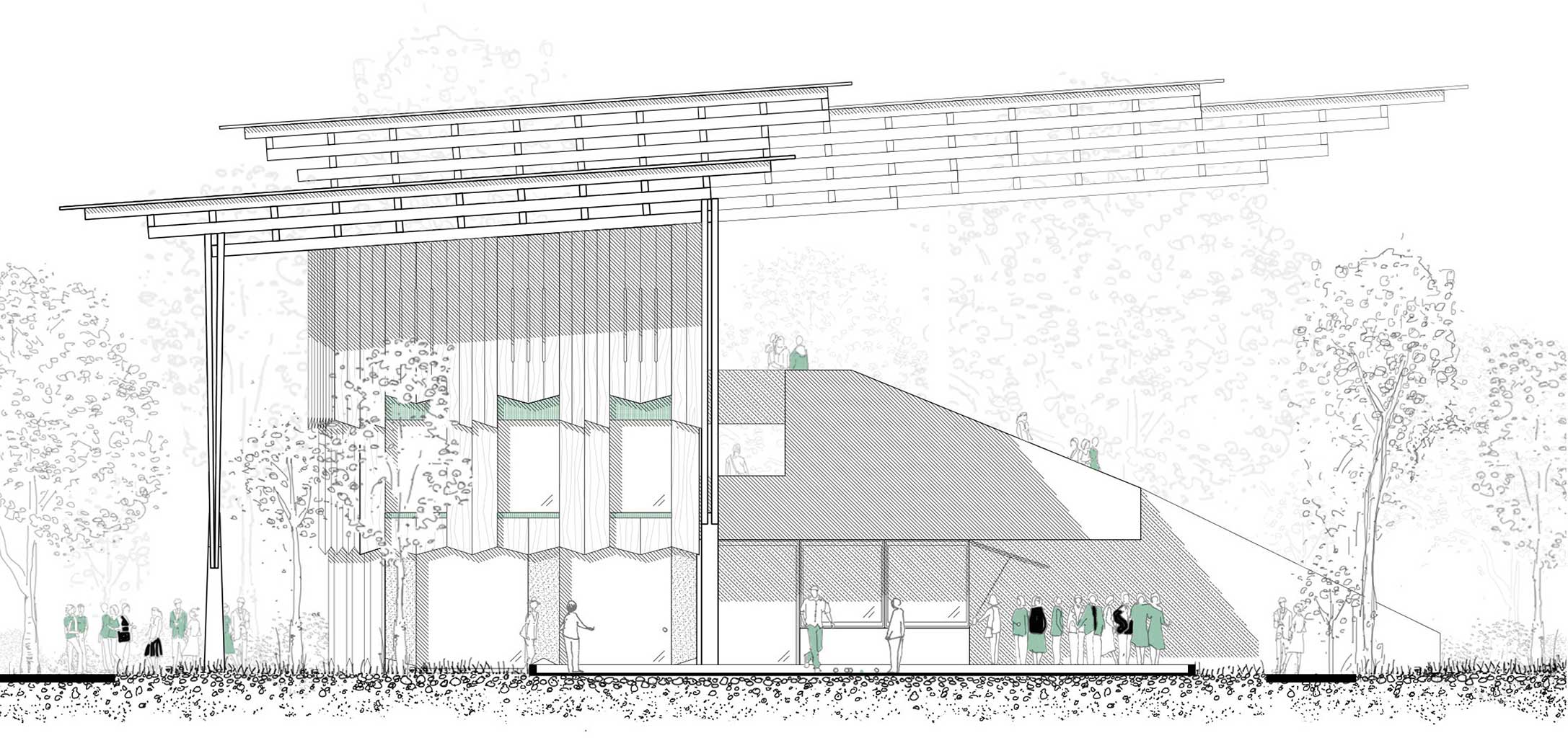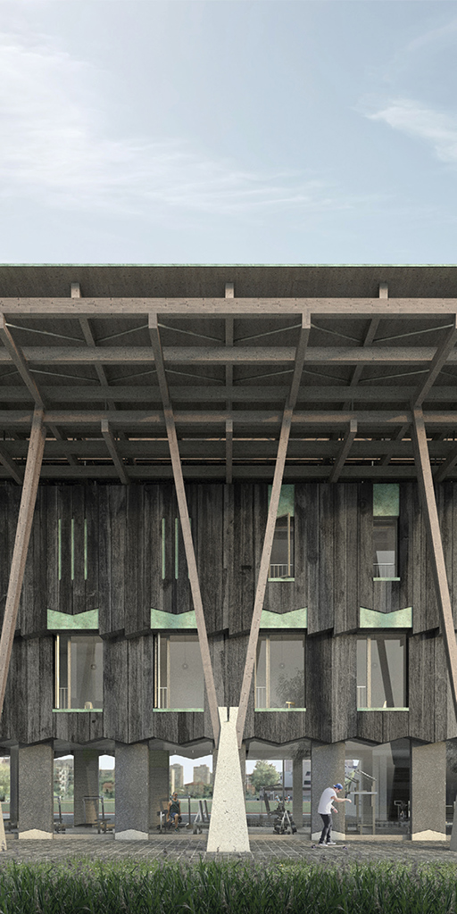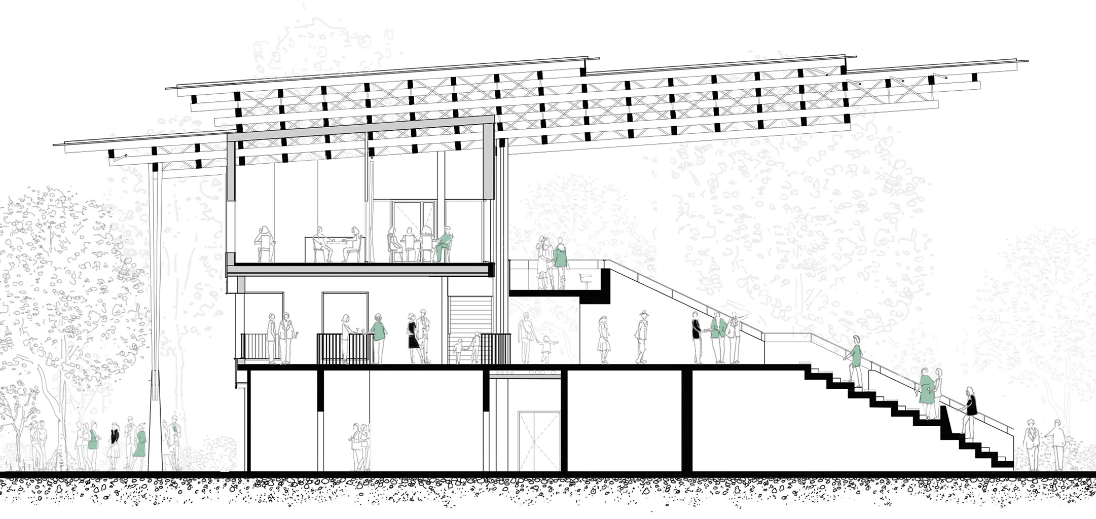 Le projet fabrique un parc urbain dont la qualité paysagère et la cohérence d’ensemble sont favorisées. Un grand toit soutenu par une structure autonome en bois rassemble, par une même figure, l’ensemble des fonctions du site et réuni ainsi les différents usagers et les promeneurs. Cette fédération des fonctions et des usages au sein d’un ensemble cohérent est renforcée par le registre architectural commun aux différentes façades. Les murs à ossatures bois de la nouvelle tribune et des vestiaires rénovés sont bardés de panneaux de bois dont le découpage singulier et les couleurs confèrent une identité propre au site et, par extension, au club.